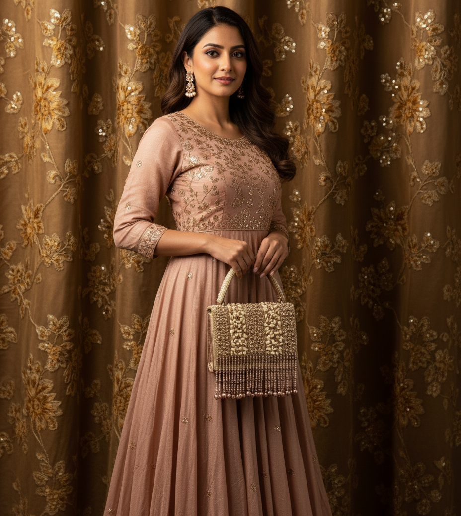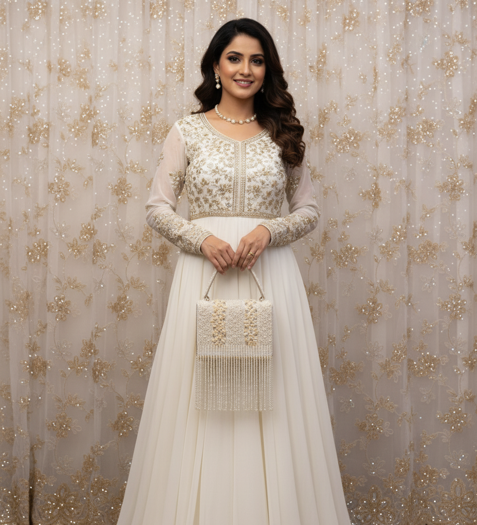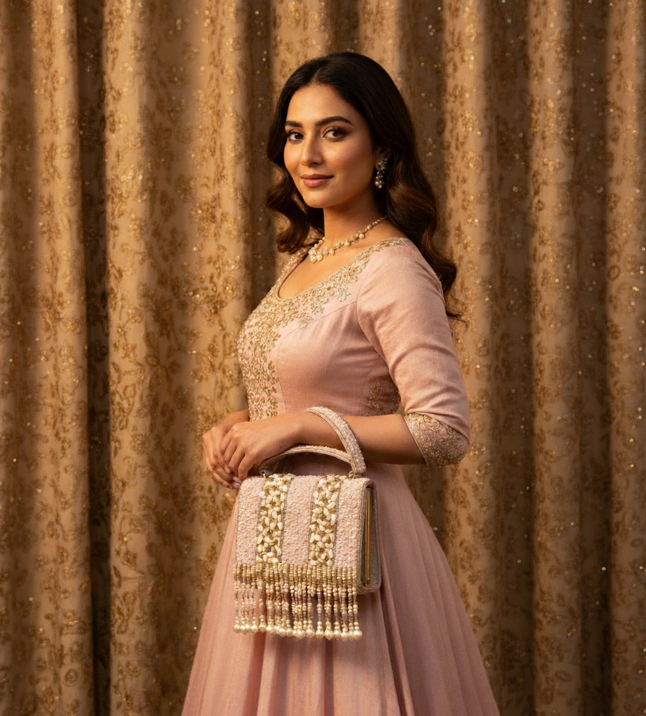 Exude opulence with this exquisite handcrafted handbag, a perfect blend of classic elegance and bohemian charm. This stunning piece features a radiant golden base, meticulously adorned with intricate ivory and golden beads that form a rich, textured pattern. The design is beautifully accented with vertical stripes of larger, lustrous cream pearls and golden embellishments, adding depth and visual interest. A cascade of shimmering golden and cream pearl fringes dances gracefully from the bottom, creating a captivating movement. Ideal for grand celebrations, weddings, or any occasion demanding a touch of luxury, this handbag is designed to make an unforgettable statement