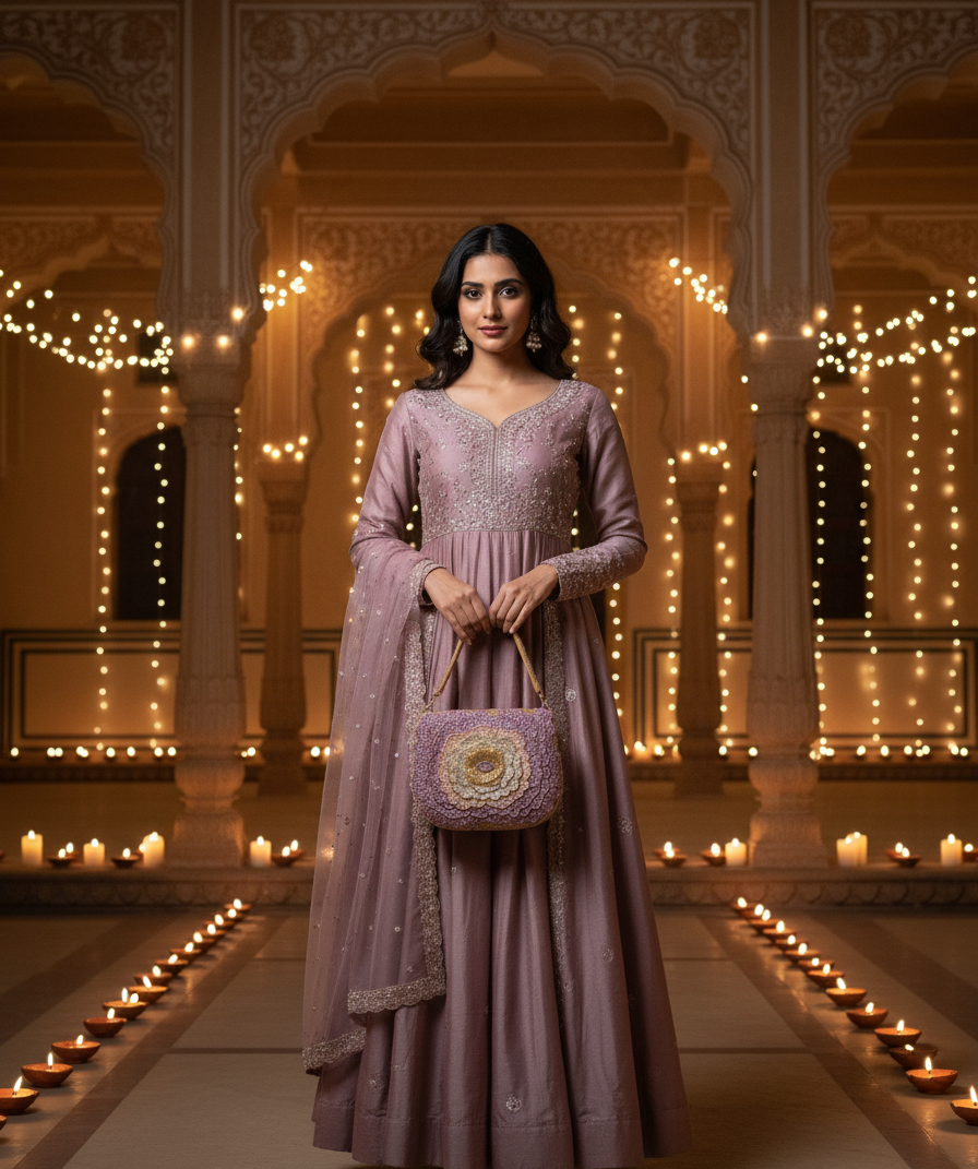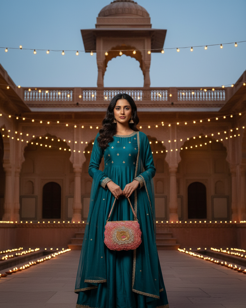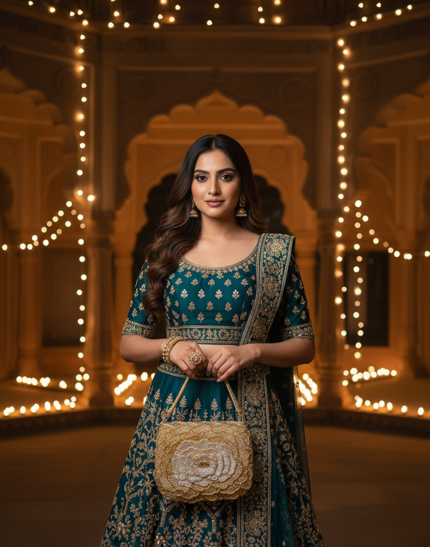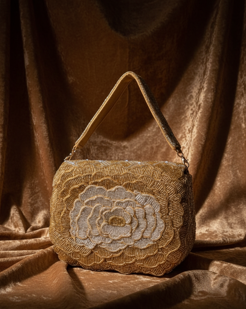 Introducing the stunning Two-Tone Floral Evening Bag, a true work of art designed to enchant. This luxurious clutch features a meticulously hand-beaded floral motif at its center, crafted from lustrous white beads, surrounded by a radiant tapestry of golden beads. The combination creates a striking contrast and sophisticated shimmer. Perfect for weddings, festive celebrations, and elegant evening events, this purse is sure to turn heads.